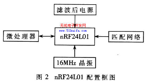 射頻芯片的選取直接影響節點的功耗,因為節點消耗能量的近2/3都用于無線收發。選用的射頻芯片為NORDIC公司的nRF24L01。該芯片功耗低,在相同工作模式下,比Chipcon公司的CC2420芯片節省近l/3的能量;工作于2.4G~2.5GHz ISM頻段;支持高速跳頻;體積很小;外圍器件少,配置簡單,且使用兩層PCB板,節省成本。nRF24L0l配置框圖如圖2所示。