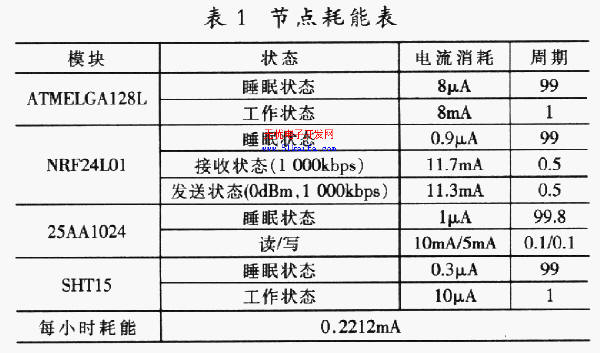 因為電能的消耗決定了傳感器節點的使用壽命,在節點的軟、硬件設計時,必須充分考慮能源的有效性。節點在各種運行模式下,必須關閉不必要的模塊以節省能量。我們采用節點定時關閉和打開的協議[3,4]且關閉與打開的時間比為1:99,使用2節1000毫安時(mAhr)的AA電池供電,節點耗能如表1所示。