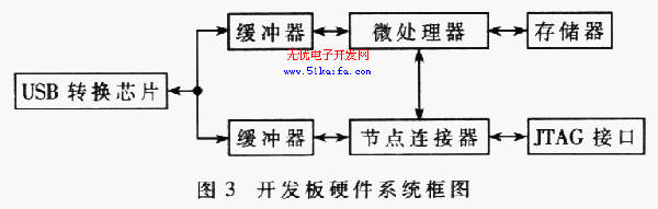 為了完成節點的開發,我們設計了開發板,其硬件系統框圖如圖3所示。節點CPU的JTAG口接在開發板上。如果使用JTAG口下載和調試程序,則需要JTAG下載器。為 此,設計了另一種下載方式,即串行下載。CPU通過 USB口接收上位機的代碼,然后通過SPI口下載到節點CPU的FLASH。CPU為中心控制模塊,接收上位機的各種命令并進行相應處理。CPU芯片選用 ATMEL公司的ATMELGAl6L,該芯片帶有可編程UART口和工作于主機、從機模式的SPI口。