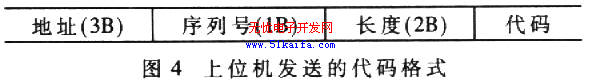 圖4中,地址指該段代碼要寫入FLASH的初始地址,包括2字節的頁地址和l字節的頁內地址;序列號表示該段代碼是全部代碼中的第幾段;長度指該段代碼的字節數,不包括地址和序列號。每一地址段代碼都采用圖4的格式。www.51kaifa.com/