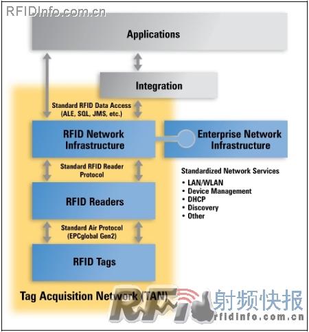 TAN架構不是單獨建立RFID設施,而是將RFID并入企業的基礎設施和完備的標準中。它不是將RFID作為一項試驗,而是作為可在企業范圍內得以應用的全球性即插即用方案。通過將RFID技術集成到現有的網絡,TAN架構為RFID在主流市場定了位。