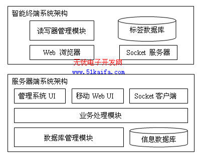 在PDA端,主要分為讀寫器管理模塊和Socket服務器模塊,分別負責標簽信息的讀取和標簽信息的傳送。利用智能終端提供的小型數據庫作為標簽的緩存,使用智能終端自帶的web瀏覽器登錄服務器獲取相關服務。
