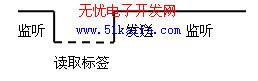該模塊中提供的服務有兩個。其一,負責啟動讀寫器,讀取周圍的標簽信息,并將讀到的標簽存入PDA數據庫中緩存。其二,開啟Socket監聽線程,啟動 TCP監聽。負責TCP監聽的守護程序在一個單獨的線程中運行。該線程主要負責建立TCP連接,打開TCP監聽,當收到需要提供標簽信息的請求后,建立另一個線程,讀取標簽并使用已建立的TCP連接,將標簽信息返回給發出請求的機器。示意圖如下(實線為監聽線程,虛線為讀取標簽線 )