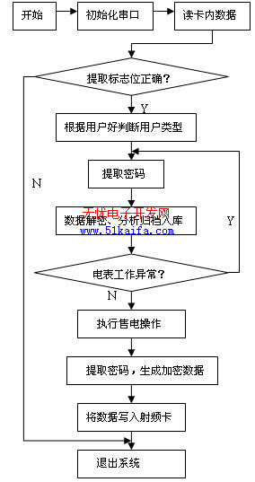 預付費售電通信模塊主要包括三個部分,包括計算機、射頻卡讀卡器和射頻卡。依據射頻卡的工作原理,射頻卡內數據的寫入或讀出都是有讀卡器向其發送電磁波,產生電磁能量而完成的。計算機與射頻卡之間的數據交換是以射頻卡讀卡器為中間媒介的,讀卡器將射頻卡內的數據信息讀出,然后通過RS-232接口送入計算機,同時上位機通過讀卡器將數據信息寫入射頻卡。如圖4所示,首先打開計算機串口并配制通信參數,然后根據預先制定的通信規則向讀卡器發送握手命令,并執行讀卡操作,將射頻卡內數據存在緩沖區內,接著判斷數據標志位是否正確,以證明卡內數據來源于電能表,如果標志位正確則進行下一步操作。提取讀回的用戶號并以此判斷該用戶所屬類型,從系統密鑰數據庫中提取密鑰對數據進行解密、分析、歸檔。通過從射頻卡讀回的信息進一步判斷電能表工作是否正常,若電能表工作異常則發出系統提示。若沒有出現異常情況則可以由系統操作員完成各項售電操作。