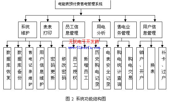 基于RFID的預付費電能表管理系統,采用了Microsoft Visual Studio.NET開發平臺和 SQL Server數據庫以及串口通信技術,能夠對區域內所有用戶的用電情況進行現代化管理,方便了用戶購電。該預付費系統兼有預付費售電以及電能表運行監測功能包括系統維護、員工信息管理、用電分析、售電業務管理、報表打印、用戶信息管理六項功能。如圖2所示。