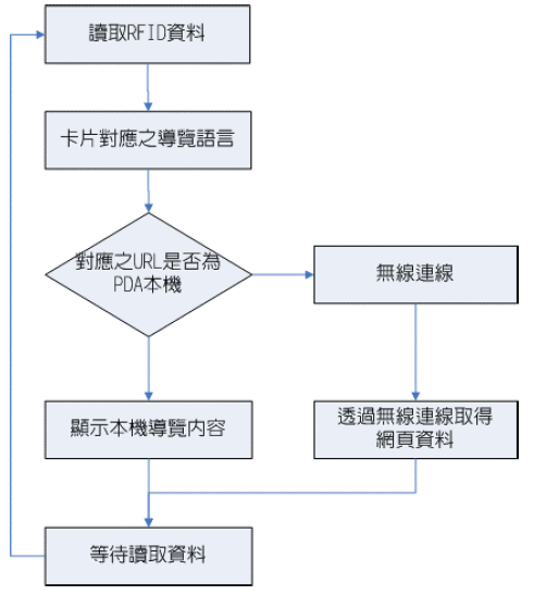 本系統主要為裝置于PDA 內之系統,主要為配合PDA 之RFID 讀卡裝置,進行PDA 讀卡后,配合所對應之語言,顯示導覽之內容資料,若對應之URL 非本機網址,則透過無線網路進行網路資源取得。
