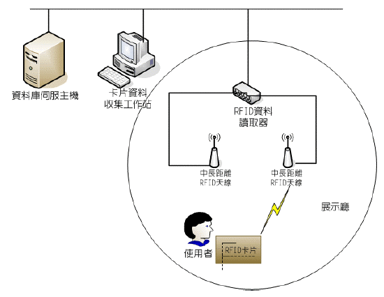 本系統主要系以中長距離之915MHz RFID 讀取器及其對應之RFID 卡片,以持續讀取RFID 資料之模式,記錄佩戴RFID 卡片之參觀民眾資料,本系統採用之RFID讀取距離最遠可達7.2 公尺,在展示現場必須依照實際展示品之大小、觀賞距離進行調整,即本設備可依需求調整接收卡片之距離,以免與其他展示品造成觀賞范圍之沖突以及「駐足觀賞」與「路過」之情形誤判。