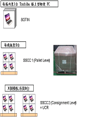第二階段測試計劃規劃航空運送貨物RFID使用關鍵性識別碼包括有SGTIN、SSCC、GRAI,場所與參與者識別是使用GLN,以下圖例說明貨物于不同包裝層級架構之下所使用的數據識別碼-