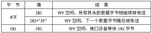終端傳輸層根據卡片返回的過程字符和狀態字節執行相應的操作,使讀寫器對數據的處理過程明朗清晰。卡片返回的過程字節和狀態字節跟應用層發送給卡的 APDU(Application Protocol Data Unit,應用協議數據單元)和VPP使用等有關。表2.1為VPP未用時的終端傳輸層中返回的過程字節。