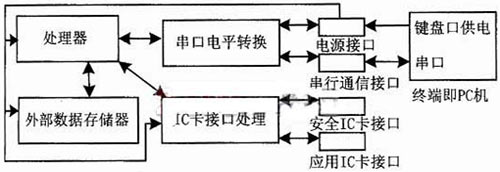 圖2.4所示為通過PC機控制管理的外置于PC機的接觸式CPU IC卡讀寫器。通過定制的數據線,該讀寫器的5V直流電源可直接由鍵盤口提供,同時數據線還負責PC機與讀寫器的串行數據交換。在大部分IC卡讀寫應用中,都涉及到IC卡的認證和數據讀寫的國解密問題,所以本讀寫器除了提供一個供用戶使用的IC卡接口卡座外,還內置了一個SAM卡,即安全IC卡卡座,以方便安裝SAM卡,保證應用IC卡讀寫時的數據安全,保護用戶的利益。
