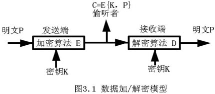 一般保密通道如圖3.1所示,在發送端,把明文P用加密算法E和密鑰K加密,變成秘文C,在接收端采用相反解密算法D使用密鑰K,將秘文C解密得到明文P。完成數據安全傳輸。即P = D{K,C}。