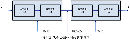 在某些場合為使簽字過程更加簡單,同時為保證簽字的有效性,利用公鑰加密算法也可以搭建數字簽字系統,如圖3.3所示,如果A否認了發送給B的消息, B可以拿出DA(P),并用A的公鑰EA解密得到P,從而正明P是A發送的。如果B把消息P竄改了,當A要求B出示原來的DA(P)是,B拿不出來。達到消息簽字的目的。