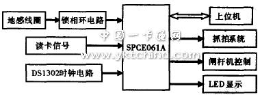 控制器設計框圖如圖2所示,系統選用SPCE061A型單片機作為主控芯片,單片機通過讀卡信號和鎖相環電路的電平變化檢測車輛的到來。DS1302時鐘電路為系統提供精確的時間信息,通過驅動LED顯示牌實時顯示車位及時間信息,系統具備與上位機的串行通信通信接口。