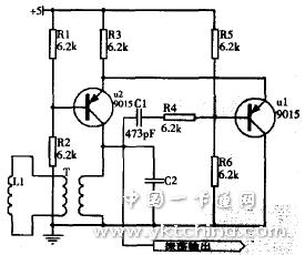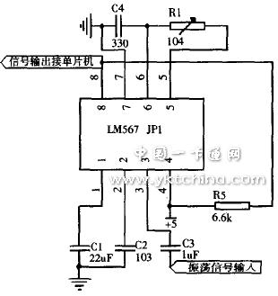 T為隔離變壓器,匝數比為1:1,三極管Ul和U2組成共射極振蕩器,電阻R3是兩只三極管的公共射極電阻,并構成正反饋。地感線圈作為檢測器諧振電路中的一個電感元件,與車輛檢測器的振蕩回路一起形成L C諧振。當有車輛通過時,將會使線圈中單位電流產生的磁通量增加,從而導致線圈電感值發生微小變化,進而改變LC諧振的頻率,這個頻率的變化就作為有汽車經過地感線圈的輸入信號。為了檢測這個變化,常用的辦法是通過單片機計算單位時間內的振蕩脈沖個數來確定車是否到來。在本設計中,需要檢測兩個地感線圈的頻率變化,如果利用單片機同時對兩路信號頻率的變化量進行測量,則系統相對較大,程序比較復雜,使得單片機負擔較重。這里介紹一種新的檢測方法:利用鎖相環音頻譯碼器LM567檢測頻率的變化,應用電路圖如圖4所示: