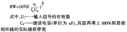 LM567的第5、6腳外接的電阻、電容決定了IC內部壓控振蕩器的中心頻率,fo=1/1.1RC。第1、2腳通常圖4鎖相環電路是分別對地接電容,形成輸出濾波網絡和環路低通濾波網絡,其中第2腳所接電容決定鎖相環電路的捕捉帶寬,帶寬的理論值可用此公式計算: