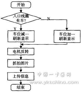整個停車管理系統示意圖如圖1所示,信息顯示牌為LED顯示屏,顯示當前時間及車位信息。當有車進入時,司機進行刷卡,刷卡信號由控制器讀入,控制閘桿機抬起,語音提示“歡迎光臨 ”,當地感線圈檢測到車輛進入時,更新車位信息,抓拍車輛圖片,閘桿機下落;同樣,當車輛駛出,司機刷卡,控制閘桿機抬起,語音提示“謝謝光臨,當地感線圈檢測到車輛離開,抓拍車輛信息,閘桿機下落并更新車位信息。而車輛的圖像信息、IC卡數據信息的處理都將由值班室的上位機完成。
