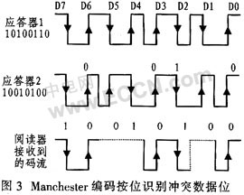 為了防止數據沖突的發生,首先確定發生沖突的數據比特位的具體位置。這里使用Manchester編碼如圖3所示。這種編碼通過電平的上升沿和下降沿表示高、低電平。上升沿為邏輯"1",下降沿為邏輯"0",不存在狀態不變的情況。因此數據傳輸過程中檢測到編碼狀態不跳變,則認為在數據傳輸過程中發生了沖突。兩個發生沖突的數據比特位必定有一個為邏輯"0",另一個為邏輯"1",這樣Manchester碼的上升沿和下降沿相互抵消,使接收器在持續時間內接收到狀態持續不變的副載波信號,即出現狀態不跳變,這在Manchester編碼中是不允許的,可以肯定該處出現了沖突。因此可以用這種方法按位跟蹤發生沖突的數據比特位的具體位置。