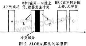 ALOHA算法足一種簡便的防沖突算法,如圖2所示。它既沒有檢測機制也沒有恢復機制,只是以一定概率確保電子標簽發出的信息準確地被閱讀器接收。ALOHA算法僅用于只讀閱讀器,標簽將數據(序列號)傳輸給閱讀器,并且在一個周期中將數據不斷發送給閱讀器,數據傳輸時間只是重復時間的一小部分,使得在傳輸中產生相當長的間歇,因此,存在一定概率,使兩個應答器可以在不同的時隙傳輸其數據,從而避免沖突。