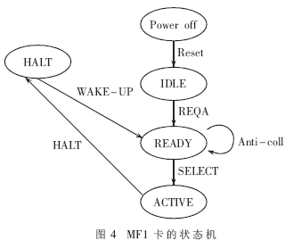 MF1卡的狀態機如圖4所示。當MF1卡進入讀卡器天線的工作區時,經Reset后進入IDLE狀態。此時可以接收從RC500發來的指令。