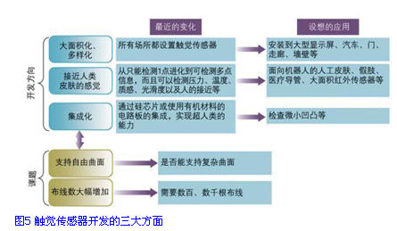 觸覺傳感器技術最近已真正開始實用化,而且具有非常高的性能。具體來說,業界正在進行以下三大方面的新技術開發(見圖5):大面積化、使用場所及應用的多樣化;目標是具有人類皮膚的感覺,不僅檢測位置,還將檢測力度、壓力、溫度、表面凹凸、有無摩擦等;利用CMOS 工藝等進行集成。