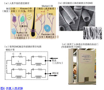 也有企業在開發類似人體感官的傳感器觸覺結構。CMC技術開發公司就利用被稱為CMC 的線圈狀碳纖維制作了多款觸覺傳感器(見圖6)。所謂CMC就是將2 根直徑約1μm 的碳素纖維繞合成線圈狀,線圈直徑大約5μm~10μm,長度約300μm。
