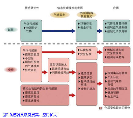 氣體傳感器技術開發的關鍵在于提高靈敏度與選擇性。隨著分析結果與氣味之間對應關系的建立、以及主成分分析等模式識別技術的進步,性能方面已經大幅增強。