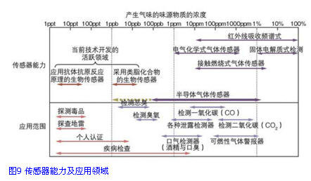 氣體傳感器有半導體式、電氣化學式、接觸燃燒式等多種類型(見圖9),各類傳感器可檢測的氣體濃度范圍及使用性各不相同。其中嗅覺傳感器大多采用了半導體氣體傳感器。