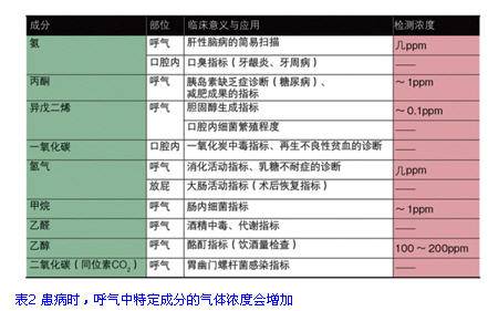 幽門桿菌是引起胃炎與胃潰瘍的主要原因。目前已有半導體氣體傳感器可以檢測CO2(二氧化碳)的濃度,從而判斷此病菌是否存在。而且此類氣體傳感器已經應用到設備上,在日本已認定為醫療設備。在美國等國家也在進行各種疾病與氣味關系的研究,并在討論是否適用于實際診斷(見表2)。