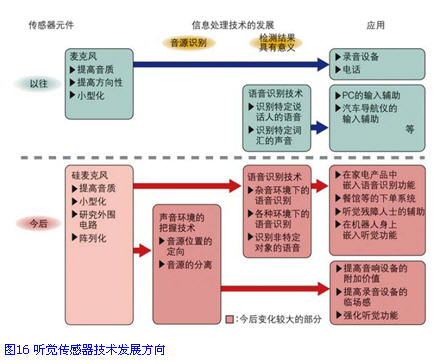 與電子設備聽覺相對應的傳感器是麥克風。目前,音響設備、PC、汽車導航儀等許多電子設備上都配備了麥克風。因此,當小型、高性能的硅麥克風作為聽覺傳感器元件上市之后,就無需再煩惱其集成到設備中時的尺寸問題,而且聽覺效果十分豐富。如果在一個設備上集成多個硅麥克風,那么設備就可以具有優良的耳朵,性能方面可達到前所未有的程度。
