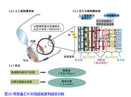 具體來說,是開發仿真眼球視網膜結構的人工視網膜芯片(見圖18)。該芯片將受光芯片、輸出控制芯片、調制芯片等通過貫通電極縱向疊層而成。目前,主要面向視網膜功能受損的失明人士,目標是取代視網膜與視神經連接,從而恢復視力。該芯片由安裝在眼鏡上的電池進行無線電磁感應供電。目前已開發出在非層積型芯片上集成輸出電路的試驗芯片,并將該芯片嵌入到兔子的眼球里,確認了其反應。