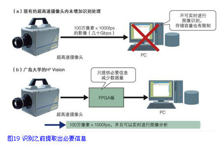 與東北大學小柳教授的開發思路類似,廣島大學大學院工學研究科復雜系統專業教授石井抱與東京大學大學院信息理工系研究科系統信息學專業教授石川正俊所領導的研究小組用現有技術也開發了階段性執行圖像數據處理的系統。石井教授開發的Hiroshima Hyper Human Vision (H3 Vision)系統,具有高精度且超高幀速率,而且可以實時處理信息。該系統由美國Photron公司的100 萬像素、1000fps 的攝像頭、FPGA信息處理電路,以及PC組成(見圖19)。