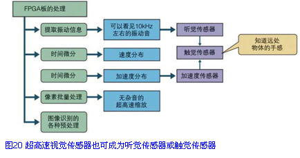 在石井教授開發的系統里,如果改變FPGA 的處理內容,并對提取的數據內容及運算處理進行各種變換,就可以適當改變傳感器的作用(見圖20)。例如,使用前后時序的數據,并對時間進行微分處理,就可以看見速度分布。石井教授的小組使用上述技術,可以讓機器人在幾米的近距離內以160km/s 的速度擊球。由于可以看到以30 轉/s 的速度旋轉的球的樣子,所以可以擊打曲線球,這已經明顯超過了人類的能力。