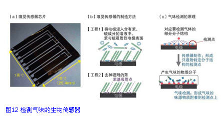 為了解決上述問題,科學家們正致力于開發仿真生物嗅覺結構的嗅覺傳感器,目前已經開發出可檢測氣味的傳感器芯片(見圖12),可檢測的濃度為ppb級,已與人類嗅覺相當。