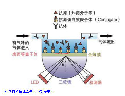 作為解決方法,科學家們已提出利用抗原抗體反應,來檢測愛滋病毒與登革熱病毒(見圖13)。該方法是以氣味的味源物質為抗原,然后制成與其1對1結合的物質,并通過其檢測出氣味。抗原與抗體的結合會造成傳感器表面折射率發生細微變化,然后用高靈敏度的表面等離子共振檢測這種變化。不光是醫療方面,預計還將用來檢測炸藥TNT 的氣味,以及探測地雷等。