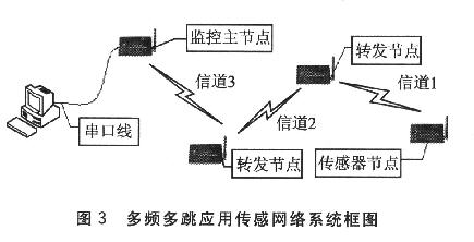 本文利用ZigBee射頻芯片支持多信道選擇的特點,采用同級多頻多跳的組網方式組建無線傳感器網絡。在編寫應用程序時,各節點結合自身在傳感器網絡中實現的不同功能,實現不同方式的信道的最優選擇。在這種方式的無線傳感器網絡的具體設計過程中,可結合具體的外部環境給出最有效的解決方案,利用一切可用的機會進行通信。下面結合Freescale公司的ZigBee射頻芯片MC13192給出這種認知無線電思想在ZigBee技術的實現。如圖2所示,無線傳感器網絡中的硬件節點通常由單片機MCU部分和射頻部分、傳感器部分共同組成。采用該節點,一個最簡單的多頻多跳應用傳感器網絡如圖3所示。