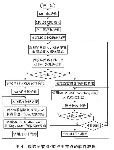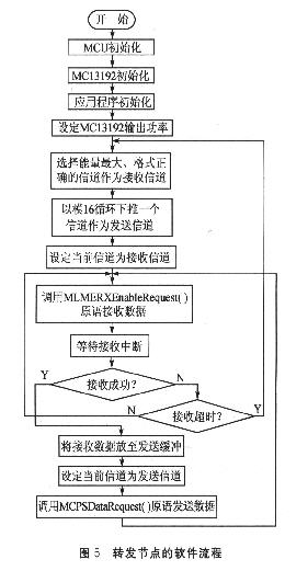 下面就以基于MC13192這一ZigBee射頻的節點組網為例,給出編程思想流程。編程基于Freescale公司提供的開發軟件平臺SMAC。圖2 中,傳感器節點、監控主節點可以采用按鍵選擇相應的功能,軟件流程如圖4所示。轉發節點,則可以采用圖5所示的編程思想。