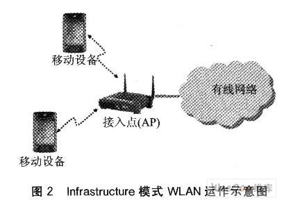 IEEE 802.11 WLAN提供兩種運作模式:Ad Hoc模式與Infrastructure模式,二者主要差別在于是否采用了接入點(Access Point,AP)。目前大部分WLAN采用In—frastructure模式,亦即移動設備藉由AP達到通信或接入有線網絡的目的,圖2為Infrastructure模式WLAN運作示意圖。