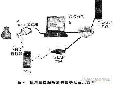 RFID在票務系統的應用,有別于導覽系統。用戶持有RFID標簽取代傳統門票,而RFID讀取器則用來驗證門票。因此,票務系統設計重點在于如何利用RFID標簽作為校史館的門票以及如何有效驗證門票合法性。通常校史館的門票可依據參觀者身份、年齡或依參觀項目或場次提供不同票價門票,使用RFID標簽取代傳統的門票也應能夠提供相同的功能。一般RFID標簽都有一個獨一無二且不能被拷貝、篡改的ID標識符,可以辨別合法的RFID標識符以達到基本的門票驗證功能。有兩種記錄RFID門票方式:記錄于票務系統服務器數據庫,儲存于RFID卷標本身的內存。圖4顯示第一種記錄售票內容方式的票務系統示意圖,基本過程是:a.參觀者購票,RFID讀取器讀取RFID標簽ID;b.售票系統存儲售票內容至票務管理系統;c.參觀者持RFID門票參觀,館務人員持RFID讀取器讀取RFID標簽ID;d.PDA利用WLAN至票務管理系統讀取門票內容。