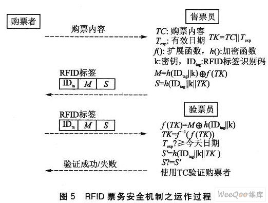 由于RFID與WLAN的無線通信特性,在實際應用中必須考慮可能的安全問題,RFID標簽標識符無法覆蓋的功能至少可保障每個RFID標簽的唯一性,防止使用復制RFID標簽方式的安全攻擊,因此基本上不用擔心RFID門票被違法復制的問題。然而RFID標簽內存內容允許讀寫,如果RFID門票的內容直接以明文方式儲存于內存,則惡意攻擊者可以很容易分析所讀取的內容,并加以修改,然后重新寫入RFID標簽內存達到安全攻擊的目的。因此,使用RFID標簽內存存儲購票內容時,必須有一套票務安全機制,避免上述安全威脅。本文提出使用單向哈希(hash)函數的票務安全機制,利用RFID標簽唯一性,使存儲于每個RFID的門票內容數據均不相同,以防止惡意攻擊者猜測門票內容。圖5說明此RFID票務安全機制運作過程。