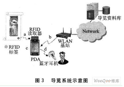 在每個欲提供導覽服務的展覽對象附近放置RFID標簽,并建立WLAN基站,使WLAN基站信號能涵蓋參觀者所有可能的活動范圍。WLAN基站連至有線網絡,有線網絡架有一臺Web服務器作為導覽網站,所有的導覽內容將被制成網頁放于此網站,每個導覽項目對應一個唯一的網址。另外必須記錄所有RFID標簽的標識符與展覽對象對應,利用此對應數據,網站中網頁轉向(redi—rect)程序可依據由導覽PDA所傳來的RFID標簽標識符提供正確的導覽內容。圖3顯示所規劃的導覽系統示意圖,其本過程是:a.RFID讀取器讀取標簽ID;b.PDA經由WLA至Web服務器讀取導覽內容;c.PDA顯示導覽內容;d.利用藍牙技術將導覽聲音解說傳輸至藍牙耳機。