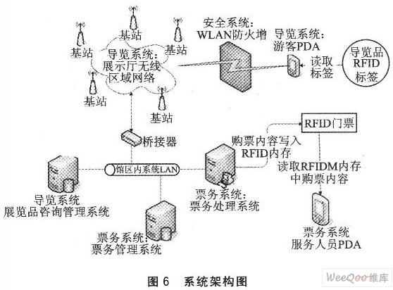 RFID可以扮演不同角色,配合使用具有WLAN網卡的PDA所開發的無線RFID標簽讀取器,可依RFID讀取器與RFID標簽的使用對象不同,分為兩種應用模式。第一種應用模式是用戶持有RFID讀取器,而RFID標簽則貼附于應用對象上;另一種應用模式則是用戶持有RFID標簽,用戶移動靠近RFID讀取器。在校史館的應用上,第一種使用模式便是數字導覽系統的應用。不僅如此,第一種應用模式也可應用于用戶的定位服務或其他個性化服務,而若加上PDA本身的計算與通信能力,各式情境感知以及需要大量運算的應用均符合此應用模式。導覽系統利用RFID短距離非接觸式感應的特性,讓游客使用PDA感應展覽品標簽,并藉由WLAN至從網絡取得展覽信息進行導覽。除此之外,由于所采用的PDA具有藍牙(Bluetooth)通信能力,將在導覽系統的語音導覽功能上利用藍牙耳機,充分發揮無線通信技術給數字導覽帶來的便利性。RFID結合WLAN的第二種應用模式是用戶持有RFID標簽。在校史館票務系統上,利用RFID標簽的數據存儲能力,記錄不同參觀者的購票內容。該票務系統利用RFID讀取器讀取參觀者的RFID標簽內容,提供多樣化的票務應用,例如依年齡、身份、參觀內容、場次,記錄不同的信息于RFID標簽中,達到利用RFID技術達到身分驗證與訪問控制目的。