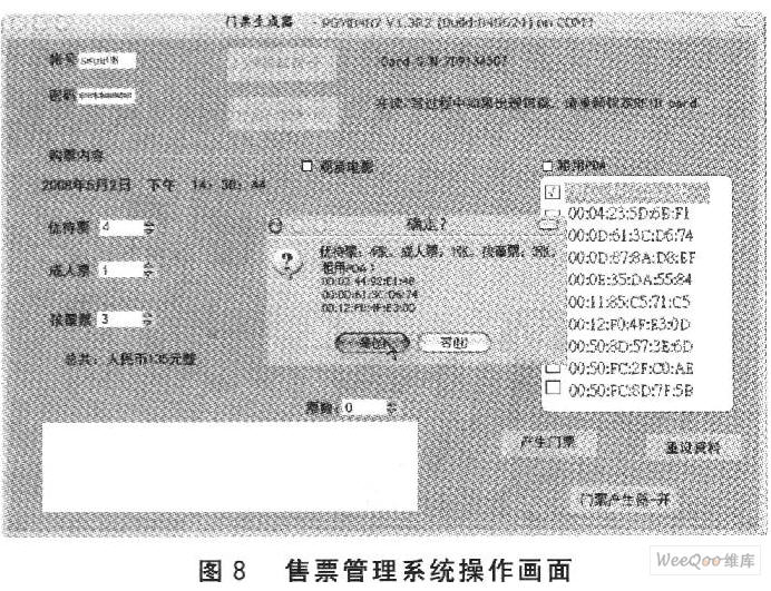 基于以上構想,搭建系統以驗證架構的可行性。系統所需RFID設備購自Giga—Tms公司。RFID標簽內含1KB的只讀存儲器(EEPROM),RFID讀寫器則采用CF適配卡形式的讀寫器插于HP iPAQ 4700 PDA,所采用的RFID設備符合ISO 14443A及MIFARE工業標準,電波頻率13.56 MHz,接口傳輸速率19 200 bps,感應距離約2~3 cm。WLAN部分使用符合IEEE 802.11b標準的Cisco Aironet 350 AP連接至有線網絡,有線網絡端的導覽系統與票務系統服務器使用PC,內建網站伺服程序。在軟件設計上,使用C#語言在Pocket PC操作系統利用COM接口通信程序與RFID讀寫器通信,并利用Web瀏覽器控件及HTTP通信協議開發導覽系統。圖6顯示本系統設計的系統架構。