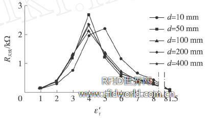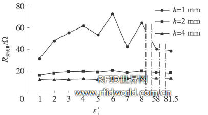 圖10 ε′r對標簽天線( Ⅱ)電阻R天線Ⅱ的影響