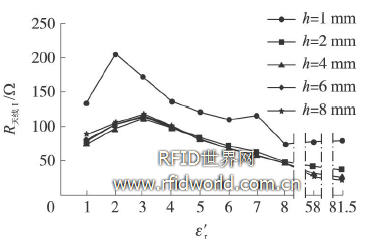 從圖7和圖8中可以看出,采用新標簽( Ⅰ)時,當h≥2 mm時,新標簽天線( Ⅰ)的電阻和電抗曲線較平緩,對物品介電常數不敏感。波動范圍在50~100Ω之間。但由于RFID標簽IC的電阻較小(20Ω左右) ,而標簽天線電阻的波動范圍(50~100Ω)仍然太大,與RFID 標簽芯片匹配存在困難。