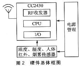 由于節點的數量較大,為了方便生產,將FFD和RFD設備的主要區別放在軟件方面;而硬件部分除了協調器具有UART接口外,其他都是相同的。總體分為核心單元CC2430、傳感器模塊以及電源管理模塊3部分。硬件的總體框圖如圖2所示。