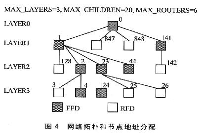 MAX_DEPTH決定了網絡的最大深度。協調器在最頂層,位于深度0;它的子節點位于深度1,依此類推。MAX_CHILDREN決定了一個路由器或者一個協調器可以處理的最大子節點個數。MAX_ROUTERS決定了一個路由器或者一個協調器可以連接的最大路由器的個數。這個參數是 MAX_CHILDREN的一個子集,終端設備使用(MAX_CHILDREN-MAX_ROUTERS)剩下的地址空間。圖4為使用自定義棧配置后的網絡拓撲和節點地址分配示意圖。LAYER1最多20個節點,其中包含6個路由節點。