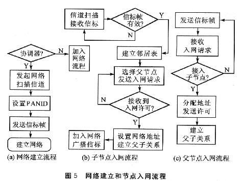 在網絡初始化過程中,協調器先將自身設置為一個簇標識符為0的簇頭,并向臨近的設備以廣播方式發送信標幀。接收到信標幀的設備(路由器或終端設備)向簇頭請求加入網絡,如果作為父節點的協調器允許該設備的加入,則將其作為子節點加入到它的鄰居表中,同時,請求加入的設備將協調器作為父節點加入到鄰居表中,成為從設備。已經加入網絡的路由器也廣播信標幀,以這種方式,直到所有設備都接入網絡。在接入網絡的同時,廣播信標幀的父節點會向接人的子節點分配唯一的 16位網絡短地址。圖5是網絡建立和節點入網流程。