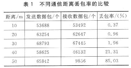 通信距離測試:CC2430芯片工作電壓為3.3 V,射頻發送功率0 dBm,空曠地帶可靠傳輸距離30 m。功耗測試:CC2430射頻發射峰值功耗30 mA,接收峰值25 mA,休眠狀態0.1μA;為了保證實時監控,傳感器得24小時工作,由此選擇了低功耗的傳感器。節點整機平均電流消耗17 mA。UPS功能測試:路由器接上220 V市電,正常入網后拔掉電源插頭,節點不掉電,不重啟;工作一段時間再插上電源,節點無死機,不重啟,充電芯片給電池正常充電。表1為不同通信距離節點數據包丟包率比較。丟包率在2%以下時,認為數據可靠傳輸。
