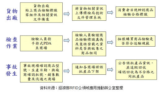 以 RFID 標簽取代無法即時辨識商品資訊與辨別真偽之現行商品檢驗標識,并結合資訊網路相關技術,以強化商品檢驗管理。