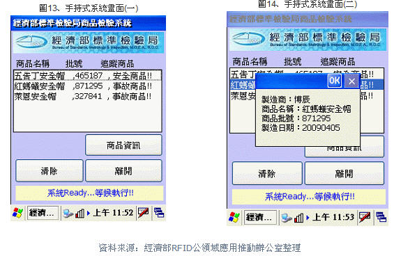 應用情境如下圖所示,廠商于 RFID 標簽內輸入所需消費商品相關資料,并于工廠出貨后貼附RFID標簽,再送至零售賣場中,同時系統同步將商品資料傳送至資料庫中,標檢局人員于零售賣場抽查驗證時,可利用手持式RFID讀取器及時檢驗。當消費商品發生意外事故時,可利用資訊系統查詢該商品之批號等資訊,及時追蹤追溯并回收此批商品。